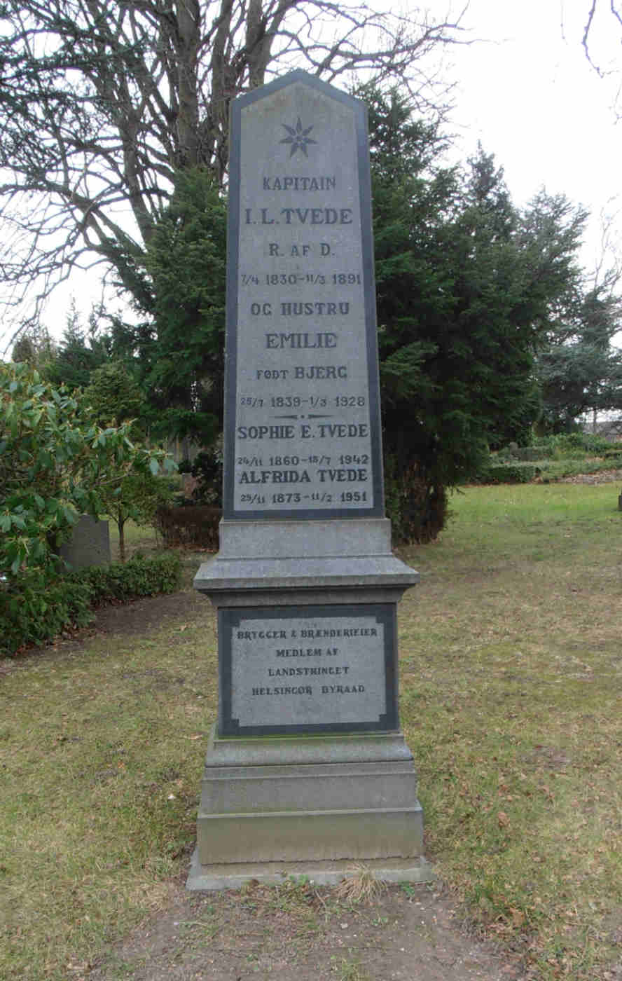 Slægten Tvede har haft stor betydning for Helsingør by, kendt for produktion af brændevin og senere spritfabrik. Tre generationer er begravet tre forskellige steder på kirkegården. Gravstedet for Jørgen Martin Hansen Tvede (1790-1854) ligger på den gamle del af kirkegården, omkranset af et jerngitter og noget præget af tidens tand. Hans søn, Jens Levin Tvede (1830-1891) har sit gravsted på den nyere del af kirkegården. Det ligger lidt mod øst og langt oppe på bakken på et hjørne. I al sin enkelhed består det af en relativ stor stele på plænen. Aktieselskabet Helsingør Spritfabrik, I.L. Tvede blev en af landets største virksomheder indenfor branchen. I.L. Tvedes Vej er opkaldt efter ham. Jens Levins søn, Charles M. Tvede (1862-1831), har sit enkle gravsted i den gamle del af kirkegården ned mod Nygade, et poleret, sort granitkors på en sokkel. Han var som faderen landstingsmand og direktør for Helsingør Spritfabrik.