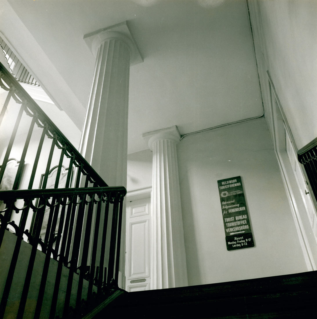 Fra rummet i porten kom man via en kort trappe ind i en nærmest grandios hall med to doriske søjler i ren græsk stil (det vil sige uden baser eller fodstykker), anvendt for første gang i dansk byggeri. Den indvendige del af palæet er undergået en del forandringer gennem tiderne. Blandt blev andet blev en tredjedel af trapperummet i 1800-tallet ombygget til garderobe, hvorved trappen formindskedes tilsvarende, og den ene fritstående søjle blev til en halvsøjle: Hermed gik lidt af den oprindelige storhed tabt.