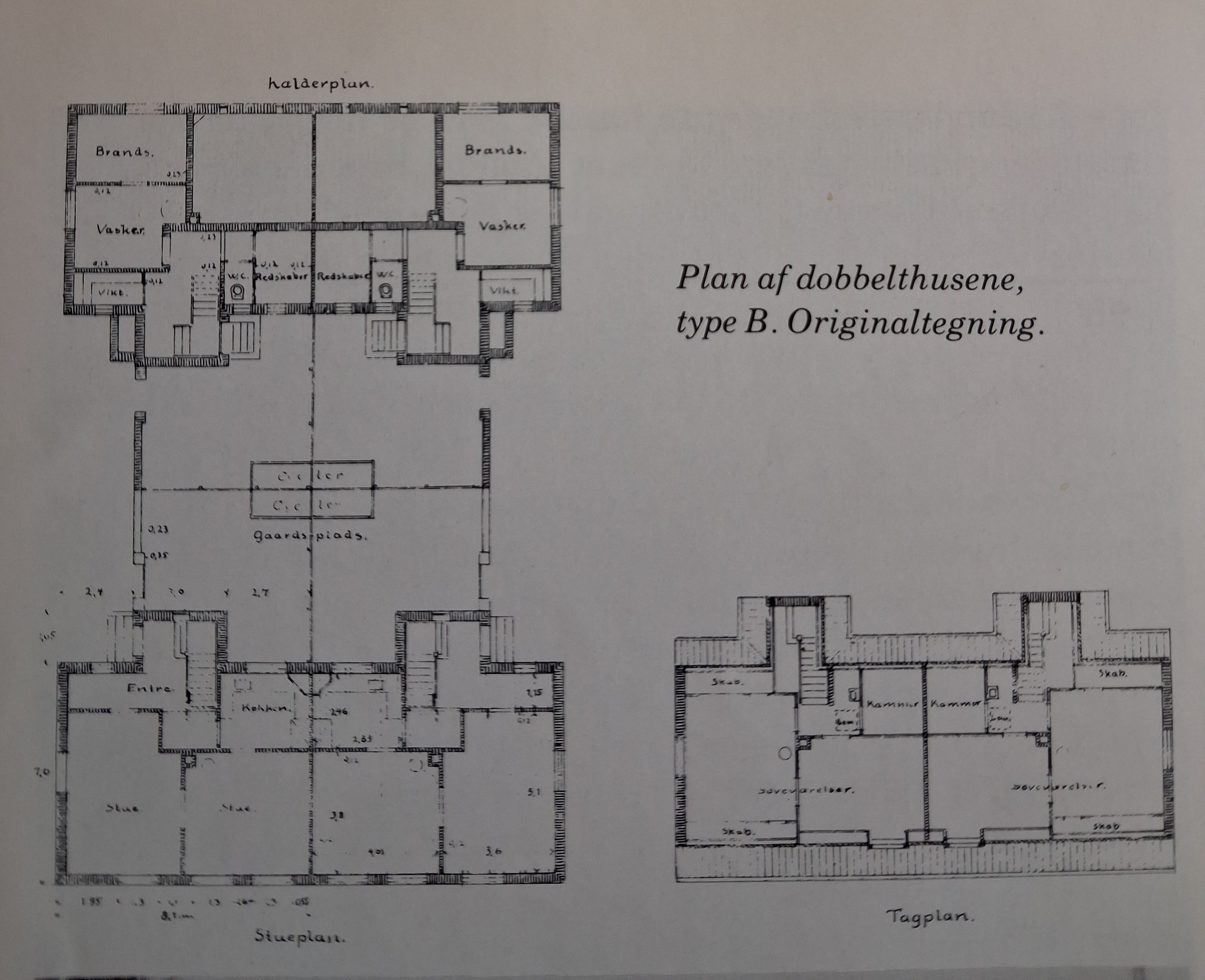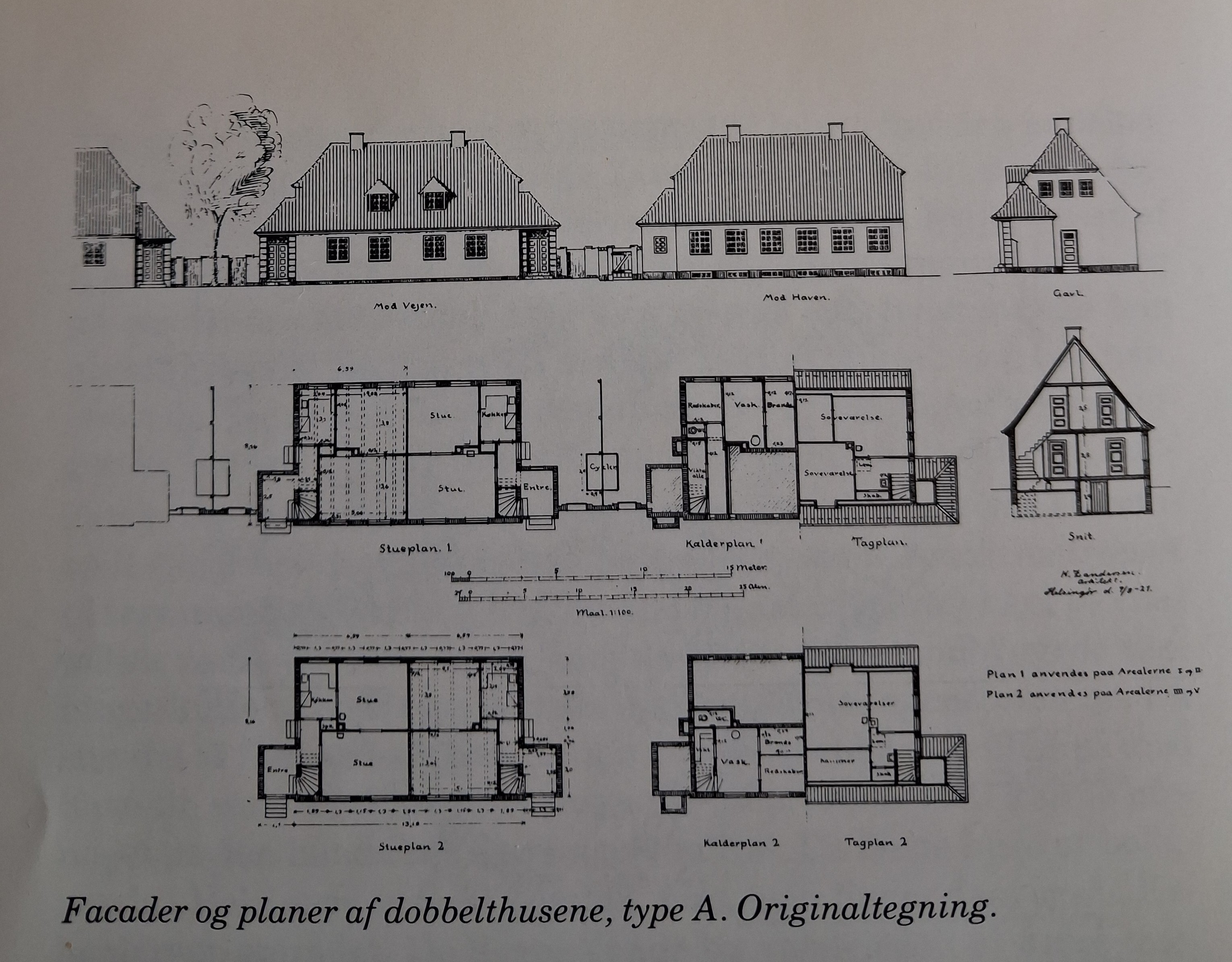 Der blev opført i alt 41 huse med 68 lejligheder, hvoraf de 27 af husene var dobbelthuse. Bygningerne var hvidkalkede med mørkegrønt træværk, røde tegltage, enten halvhvalmede eller rene sadeltage og udstyret med kviste. Bebyggelsen bestod af 5 hustyper: 3 slags dobbelthuse, som alle var delt op på midten i to ens lejligheder samt 2 slags enkelthuse. Til hver bolig hørte et lille cykelskur. Arkitekten lagde vægt på boliger med høj kvalitet og godt håndværk. I dag er de fleste sprossevinduer samt de originale døre skiftet ud, og ikke alle fornyelser er udført med veneration for stedet. Det blev et meget attraktivt sted at bo. Normalt kunne kun medlemmer af boligforeningen komme i betragtning, og boligerne kunne gå i arv fra generation til generation.