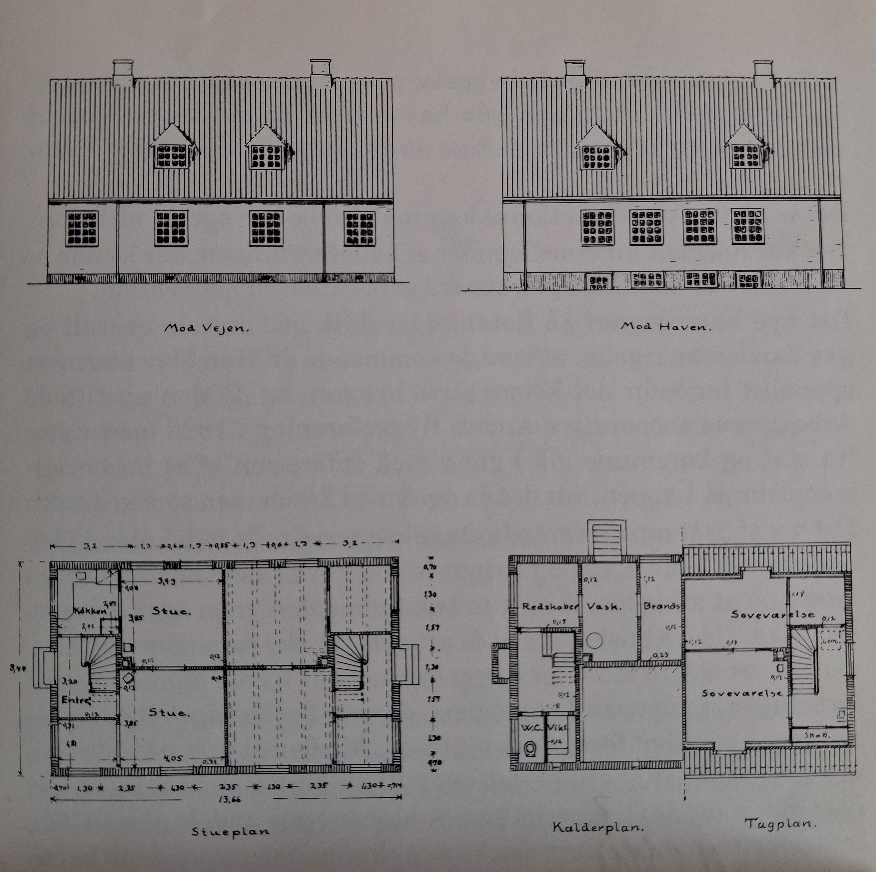 Facade og plan af dobbelthuse. Fra "Huse i Helsingør", bd. 2, side 35