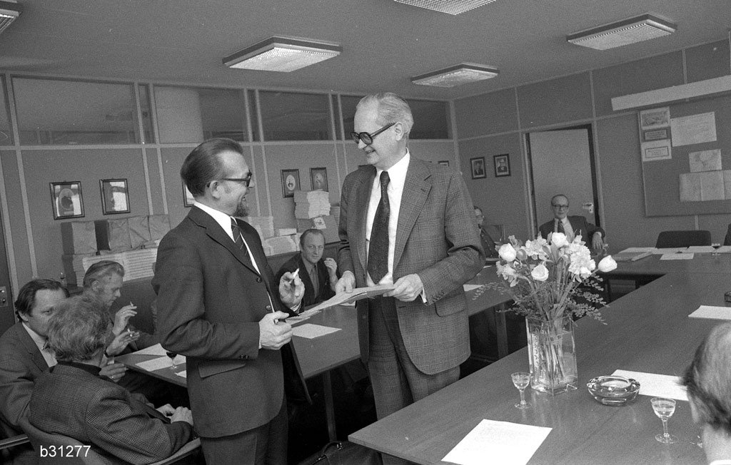 De to herrer, der står op er tv. skoleinspektør Poul B. Andersen fra Borupgårdskolen og th. skoledirektør Mogens Gericke. Imellem de to ses siddende skoleinspektør Vagn Højer Larsen fra Skolen ved Kongevejen. Foto: Anne-Sofie Rubæk 9/4 1975