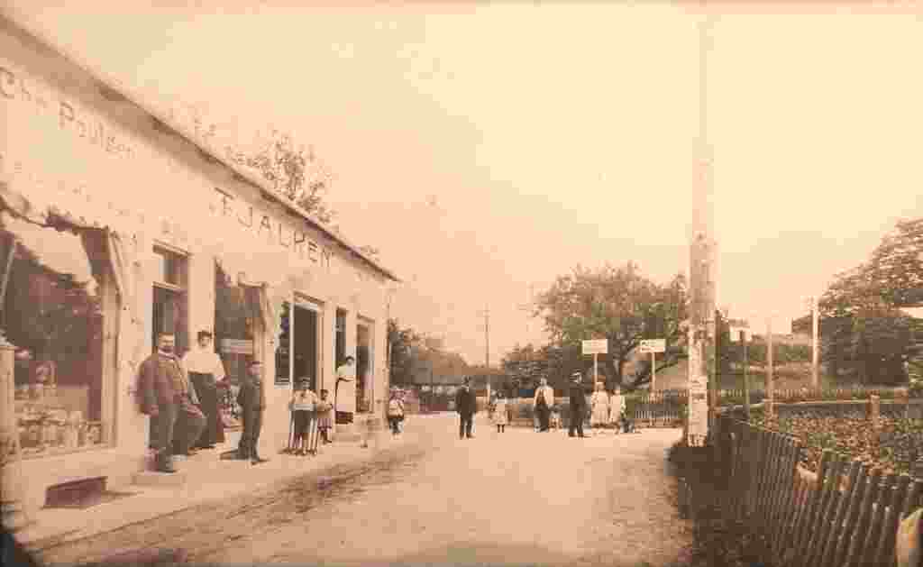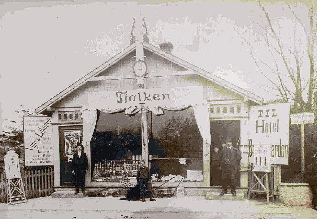 Den første fotostat fra 1900 viser den lille træbygning, der var den første købmandsbutik på stedet. På billedet kan man se, at der står Aage Petersen på facaden, men andre kilder siger, at det var en anneksforretning til købmand Geutche’s købmandsforretning i Helsingør. Men sandt er det vist nok, at den kun var åben om sommeren, vel sagtens for at profitere af de mange sommergæster, der på det tidspunkt var begyndt at blive en del af livet i Hornbæk om sommeren.