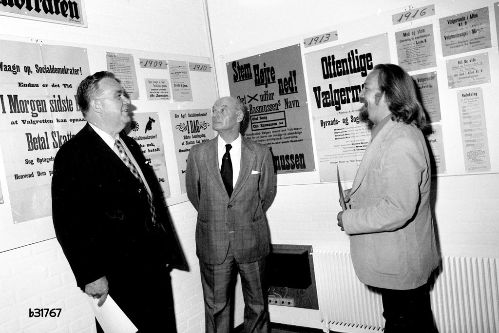Efter at Socialdemokratiet havde mistet 24 mandater ved folketingsvalget i 1973 og oplevet, at Fremskridtspartiet ved valget kom i Folketinget med 28 mandater, gjorde de socialdemokratiske partiforeninger i Helsingør sig klar til den helt store valgkamp forud for folketingsvalget den 9. januar 1975. Blandt de mange aktiviteter blev der afholdt en plakatudstilling på Hovedbiblioteket, som skulle fortælle vælgerne, at nu måtte de altså se at tage deres stemmeret alvorligt og passe på demokratiet. Udstillingen viste gamle valgplakater om valgmøder, valgregler, opfordringer til at stemme på partier og personer mv. Ved præsentationen af udstillingen fandtes blandt gæsterne den socialdemokratiske borgmester Ove Thelin (i midten), det konservative byrådsmedlem Børge Jensen (til venstre) og Oswald Christensen, der repræsenterede Socialistisk Folkeparti.