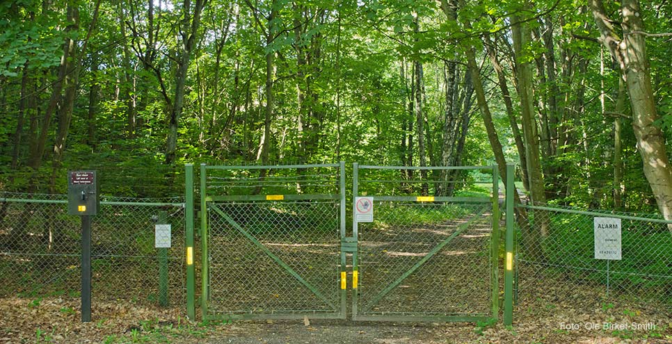 Hele området er kraftigt indhegnet med pigtråd øverst og tydelige skilte med ”adgang forbudt”, ”alarm” og ”videoovervågning”.
